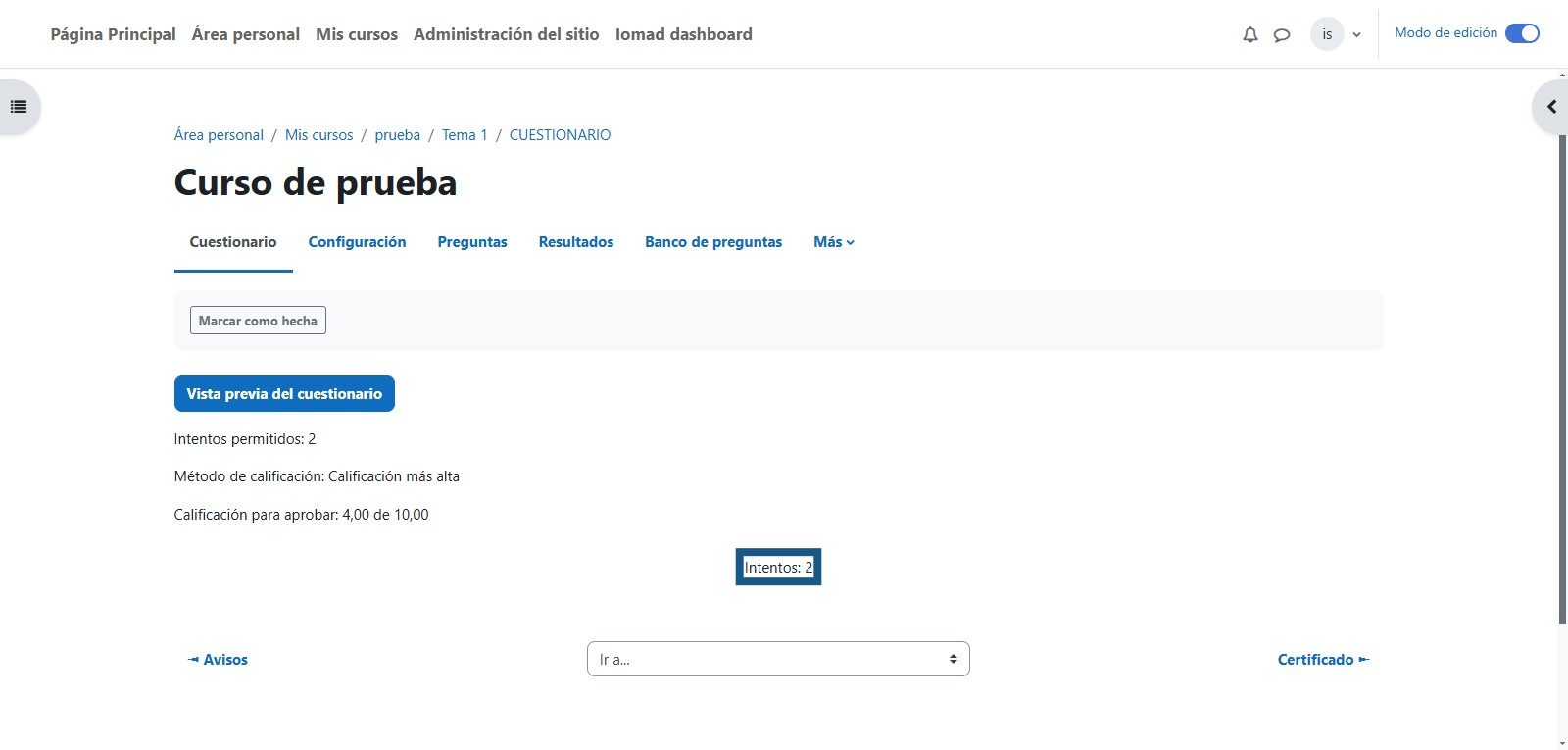 Debe de ingresar a los intentos del cuestionario.