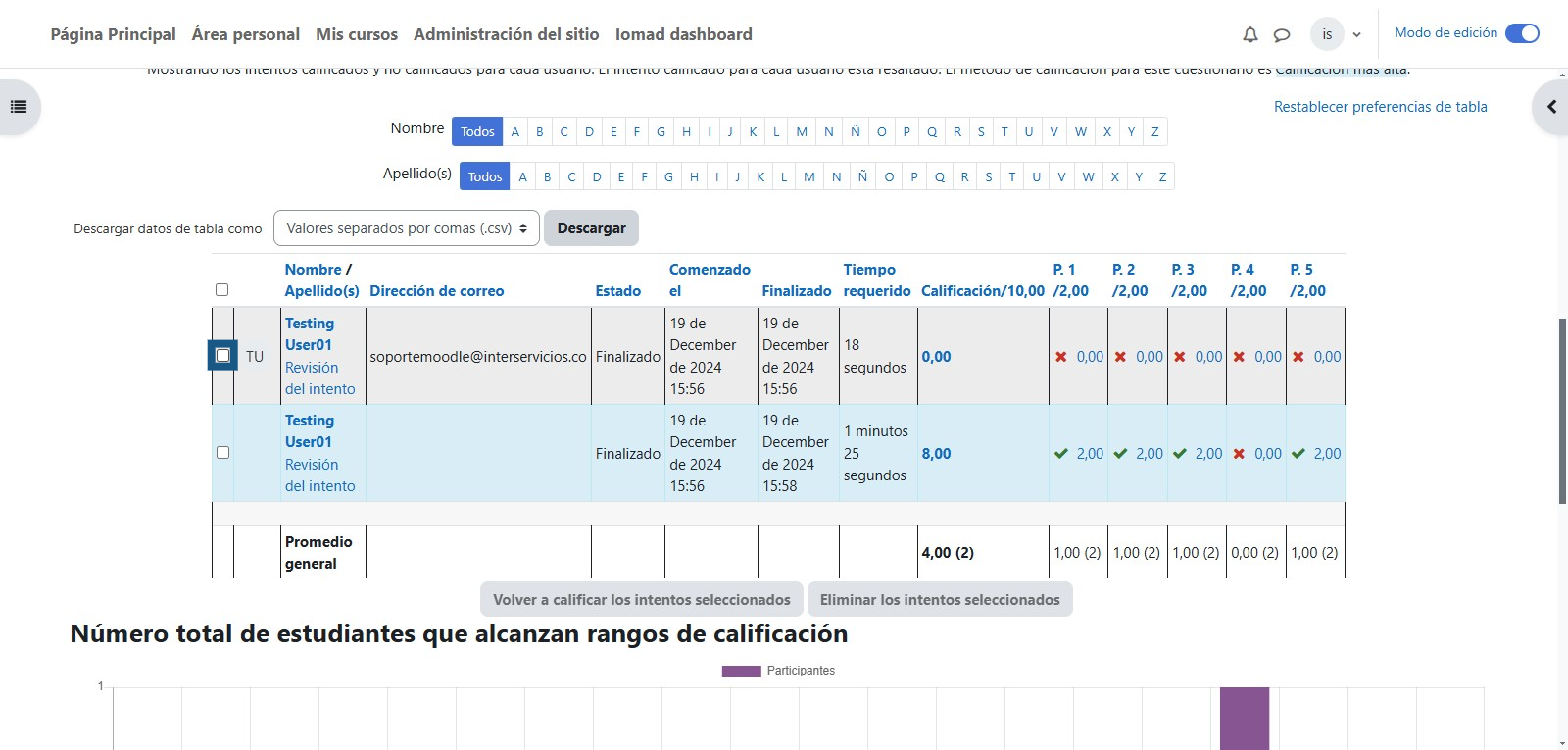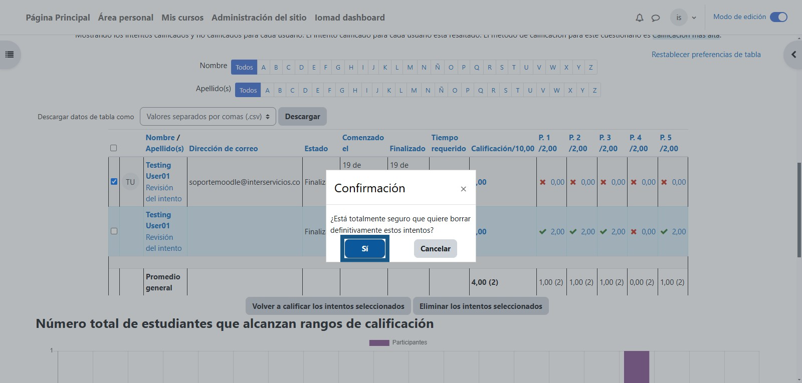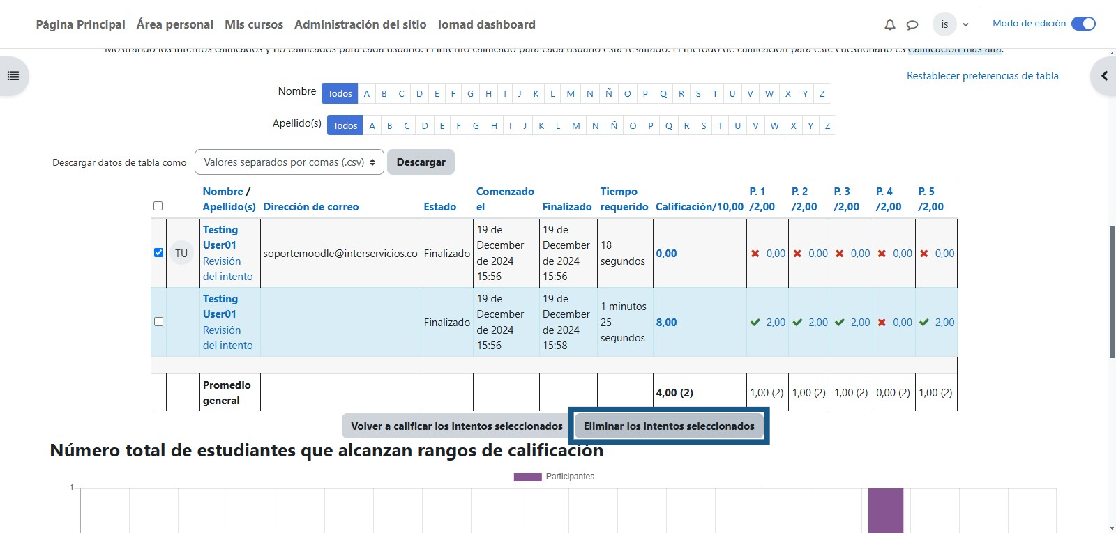 Para eliminar el intento debe dar clic en la opción de "Eliminar los intentos seleccionados"
