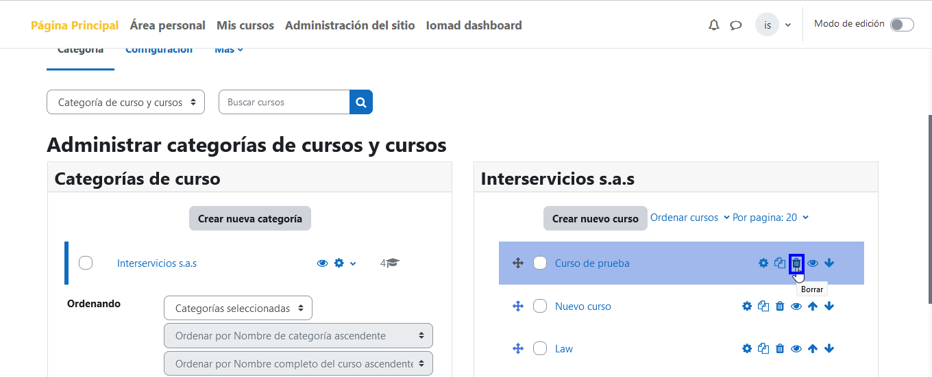 • Para verificar que el curso ha sido eliminado correctamente, intente buscar el curso nuevamente en la sección "Administrar cursos y categorías". Ya no debería aparecer en la lista.