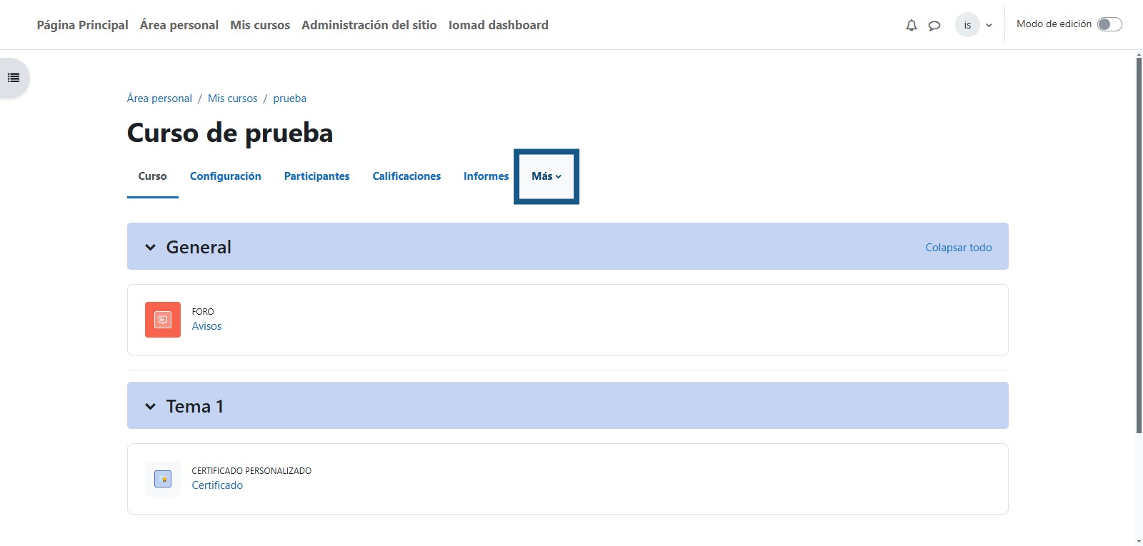 Una vez ingresado al curso se debe de dar clic en la opción "Más"