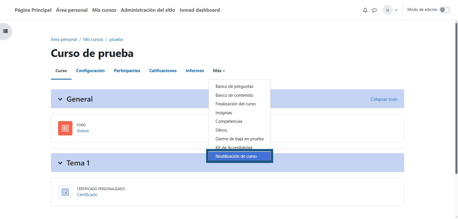 Paso 2: Dar clic en la opción "Reutilización de curso"