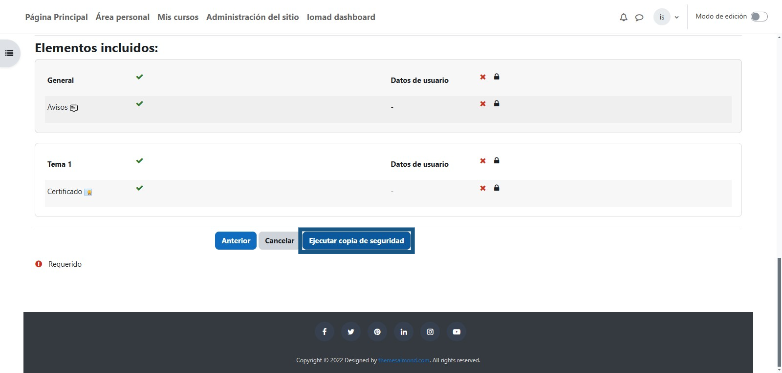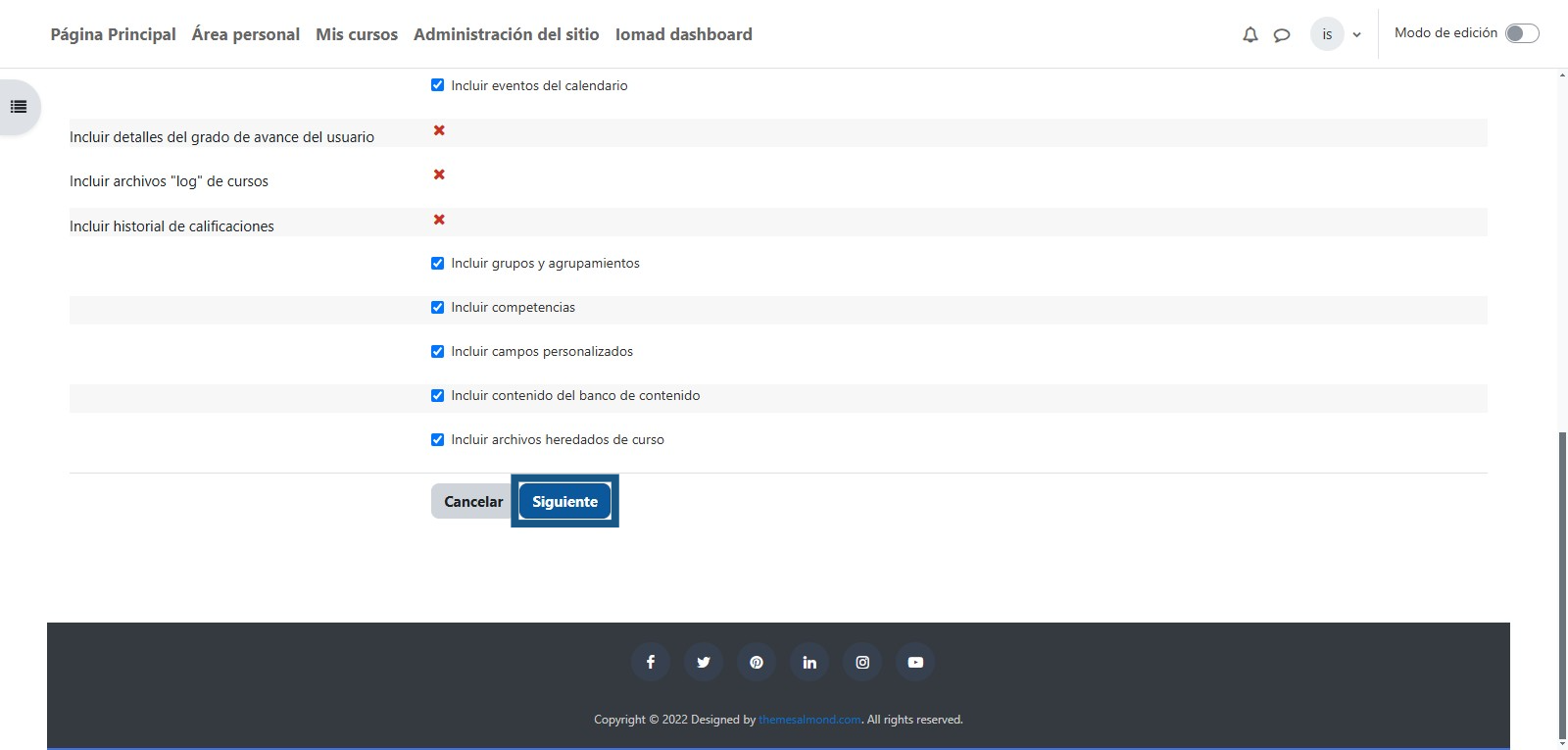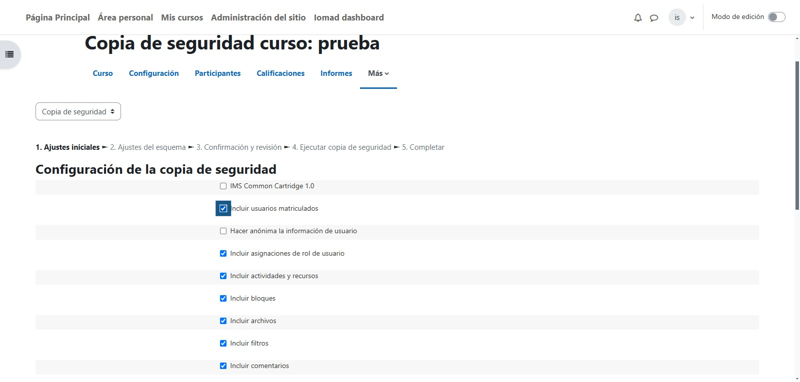 Una vez seleccionada la opción, aparecerá el listado de recursos que desea incluir en la copia de seguridad. Tener en cuenta que si desean que el curso pase a la nueva versión sin los usuarios que actualmente se encuentran matriculados debe de desmarcar la casilla "Incluir usuarios matriculados"