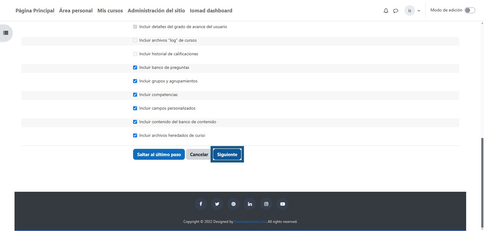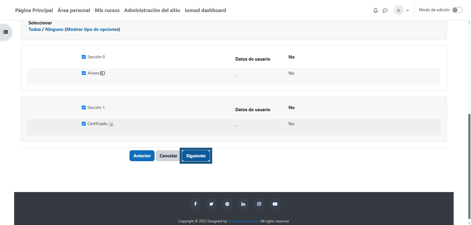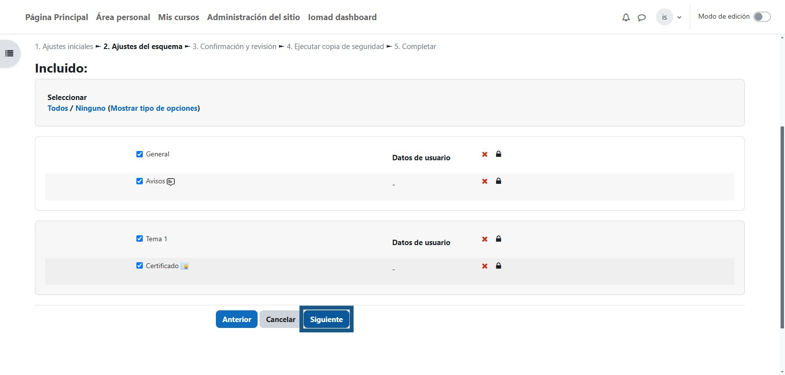 Se debe de seleccionar las actividades con las que se creara la copia de seguridad y dar clic en el botón "Siguiente". Por defecto están todas las actividades marcadas para que la copia de seguridad se cree con las mismas actividades en el curso de la nueva versión.