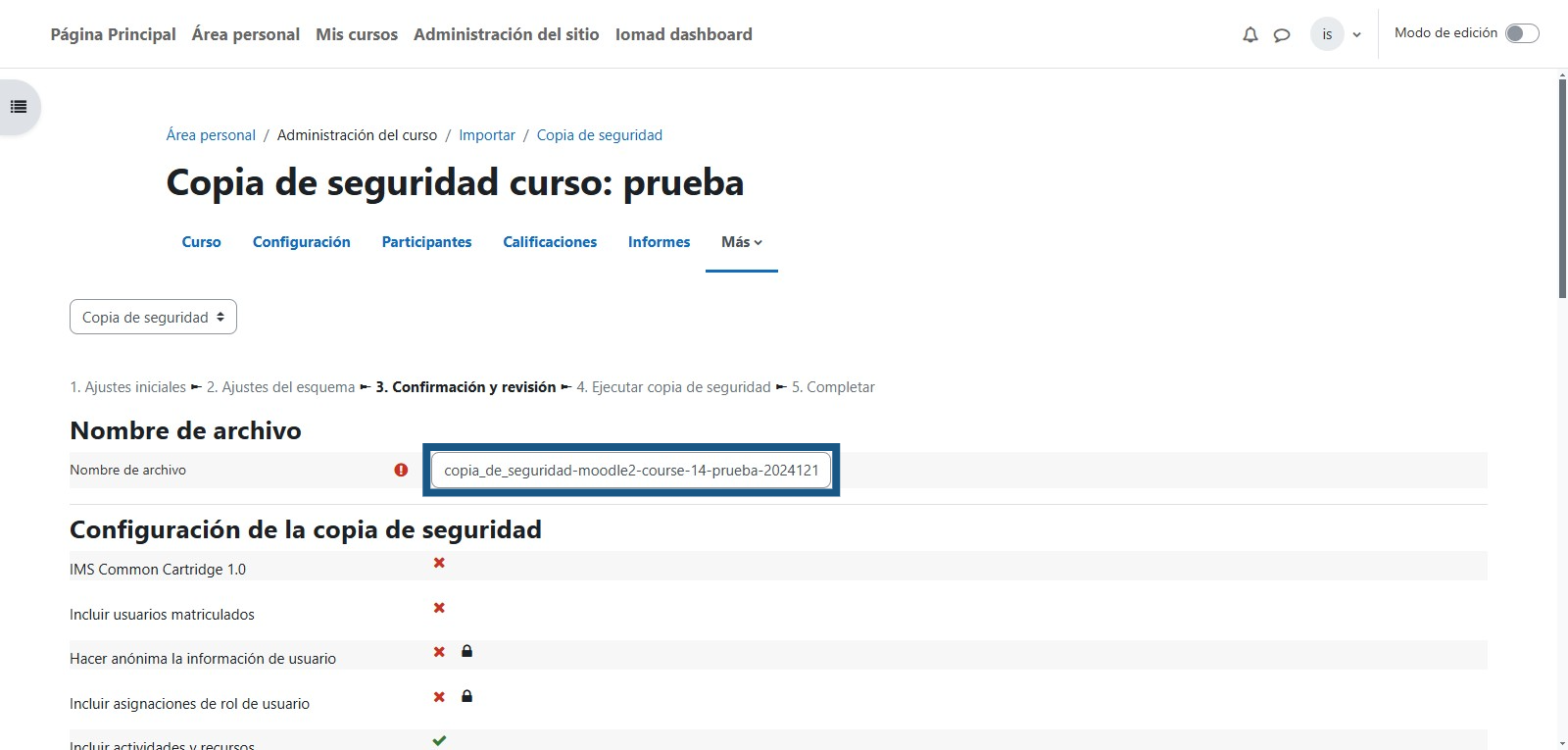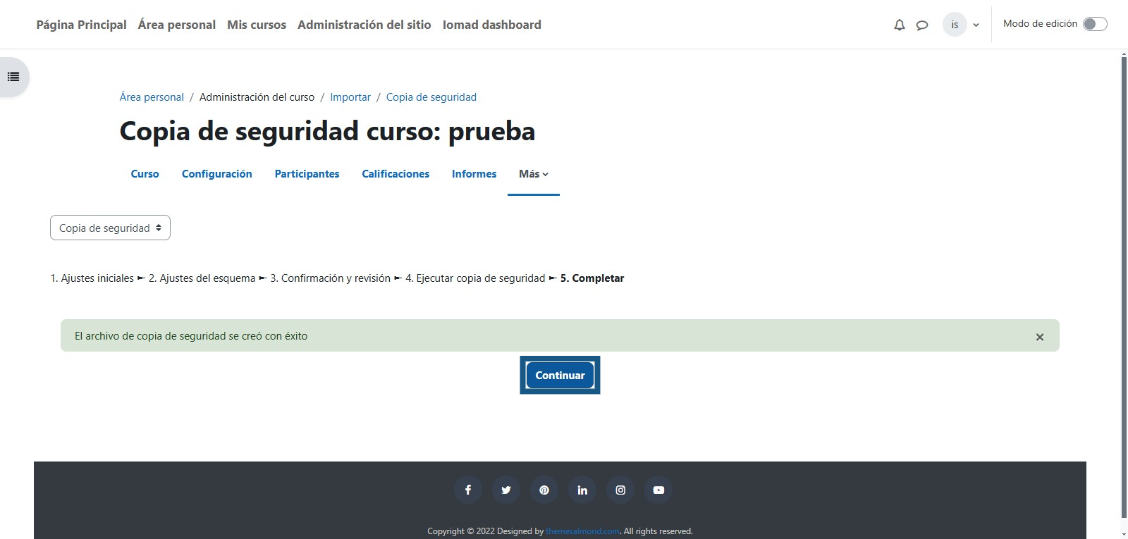 Una vez que se termine de crear la copia de seguridad la cual de acuerdo al tamaño del curso tomará más o menos tiempo se debe de dar clic en el botón "Continuar"
