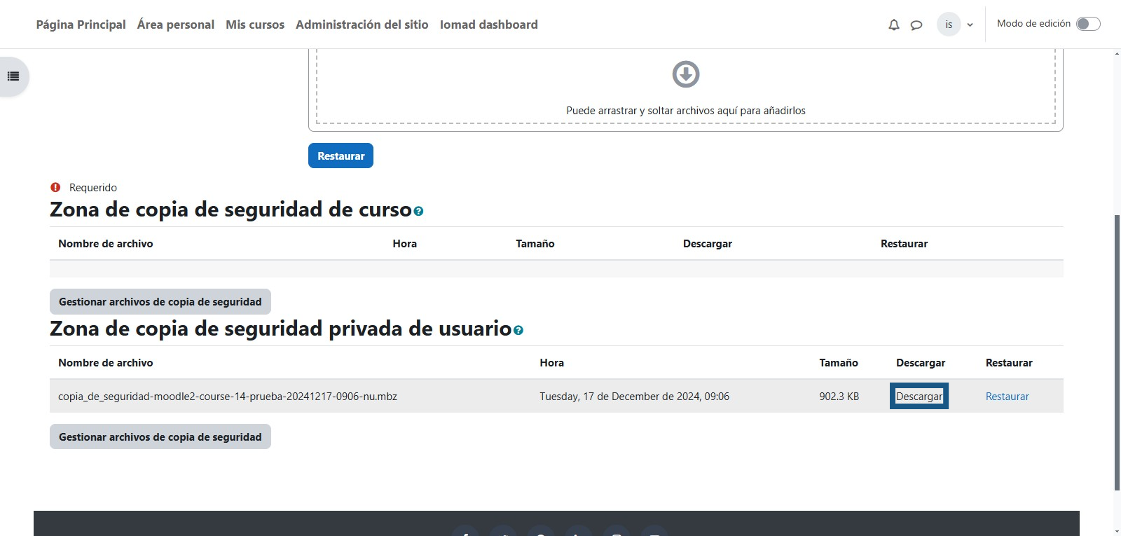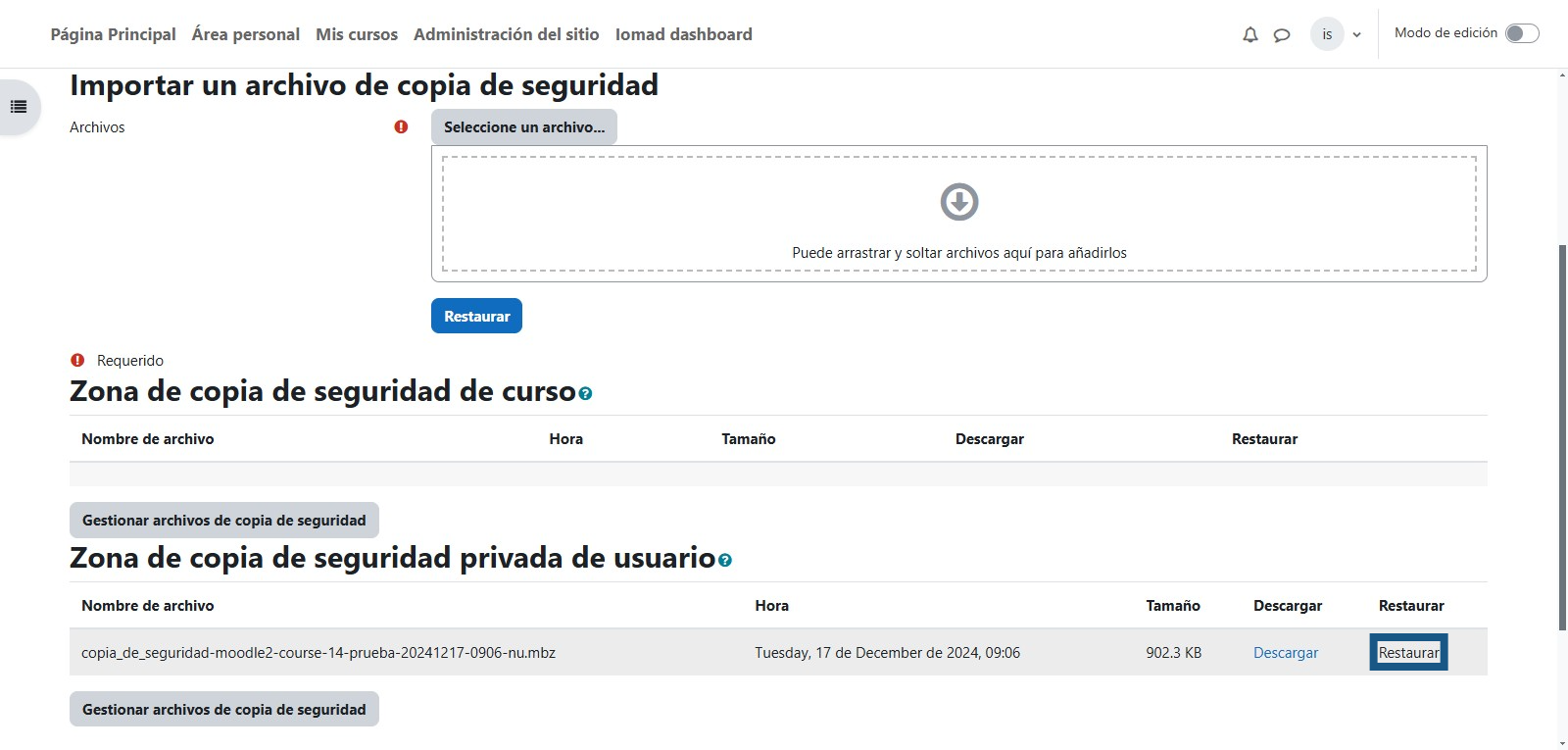 Para restaurar la copia de seguridad en el curso que tendrá la nueva versión se debe dar clic en "Restaurar"