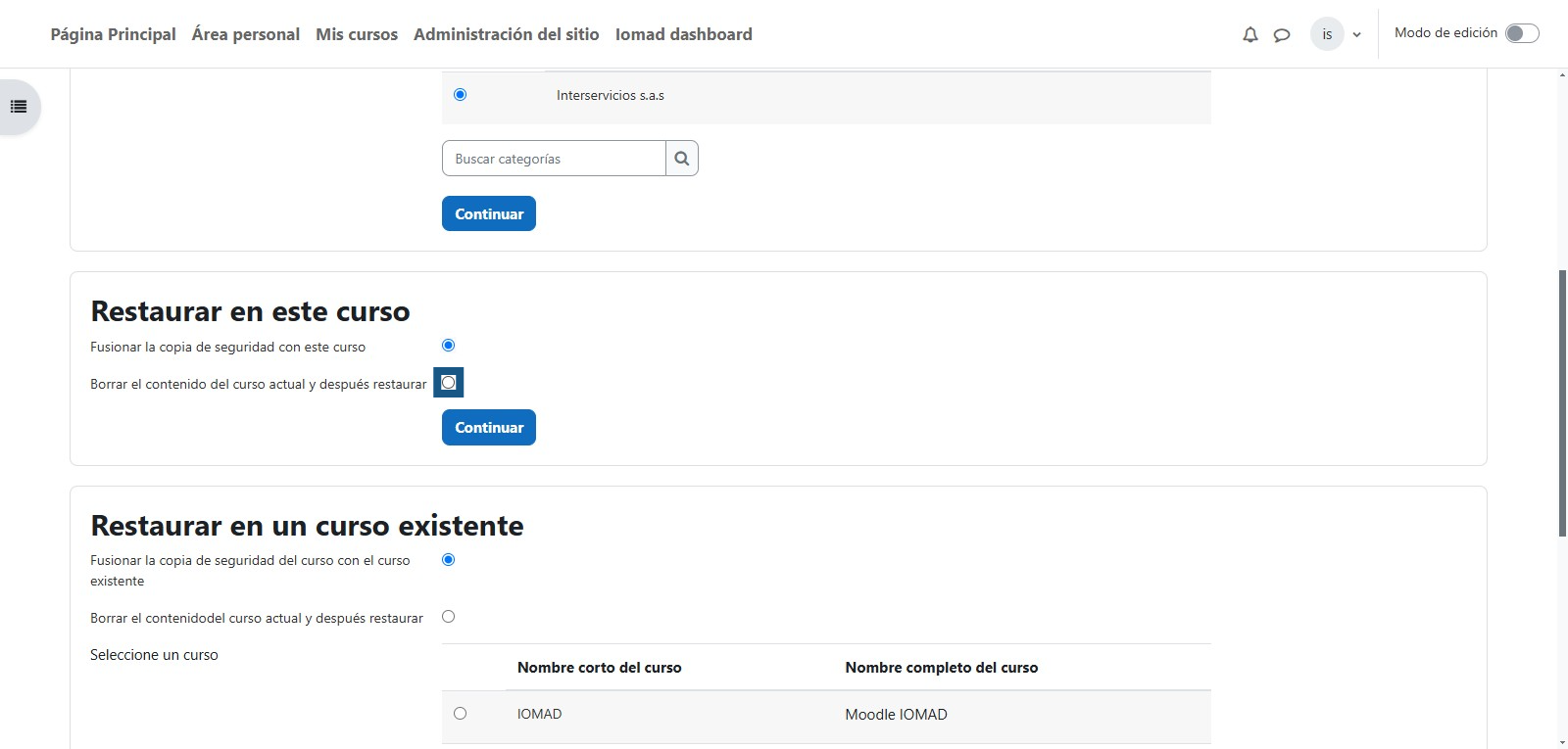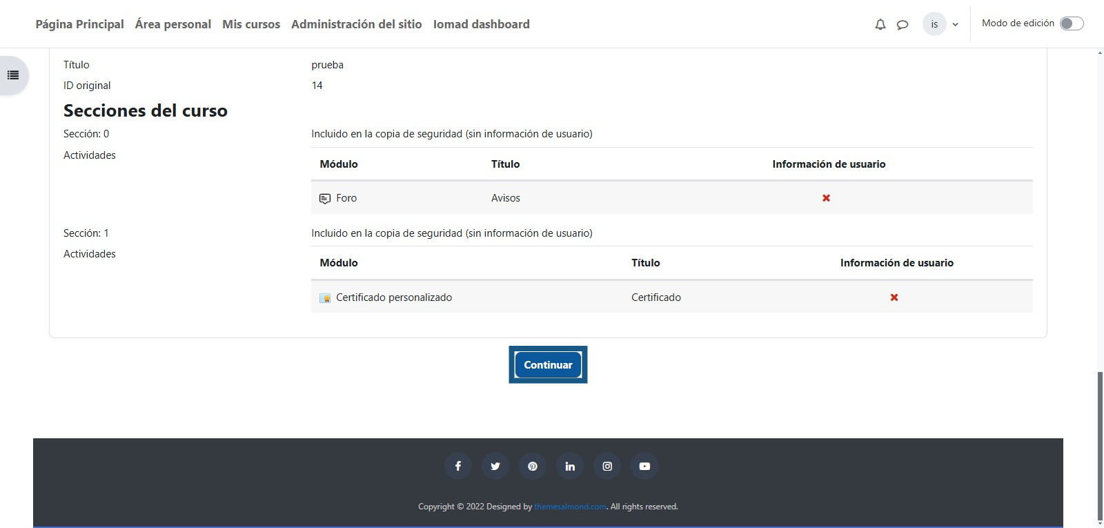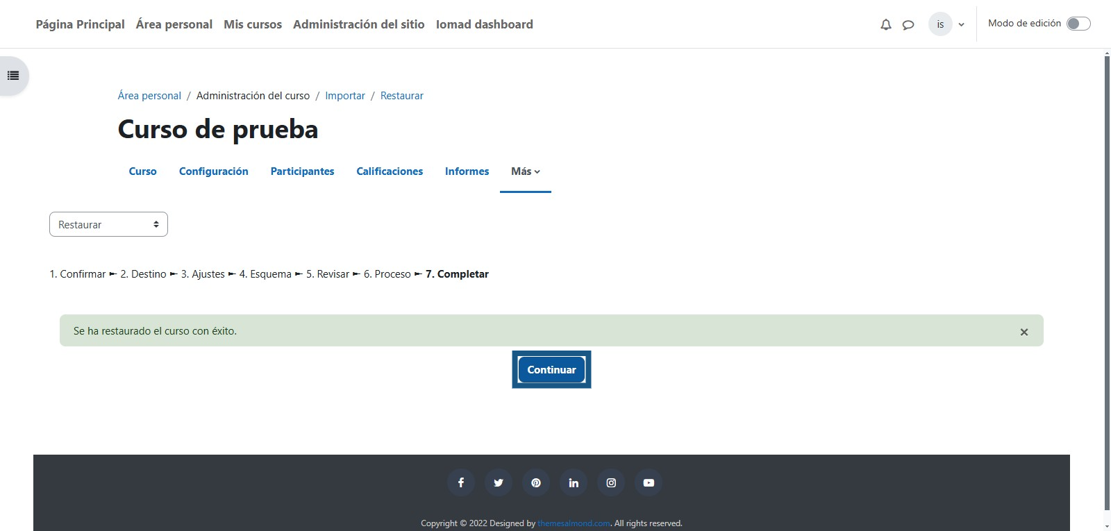 Una vez que finalice el proceso de restauración el cual dependerá del tamaño del curso, se debe dar clic en "Continuar" para que redirija a la nueva versión del curso con base a la copia de seguridad que fue restaurada.