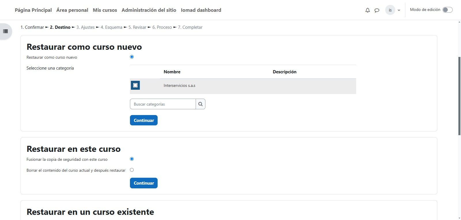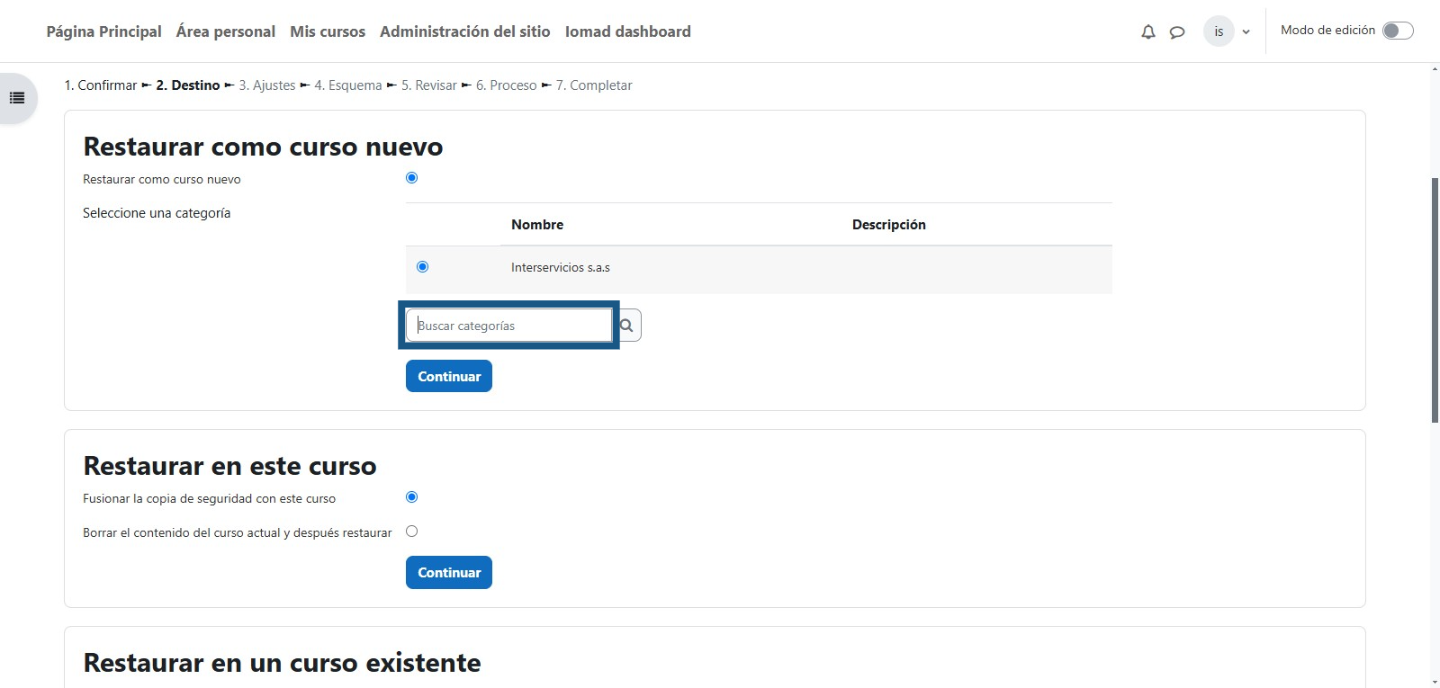 Se debe de seleccionar la categoría en la cual se restaurará la copia de seguridad del curso.