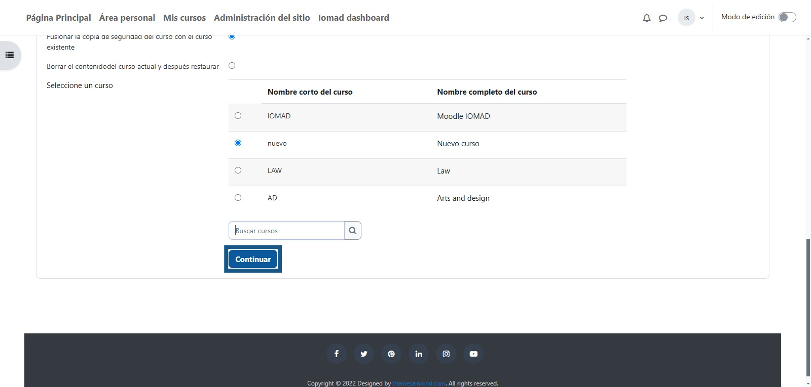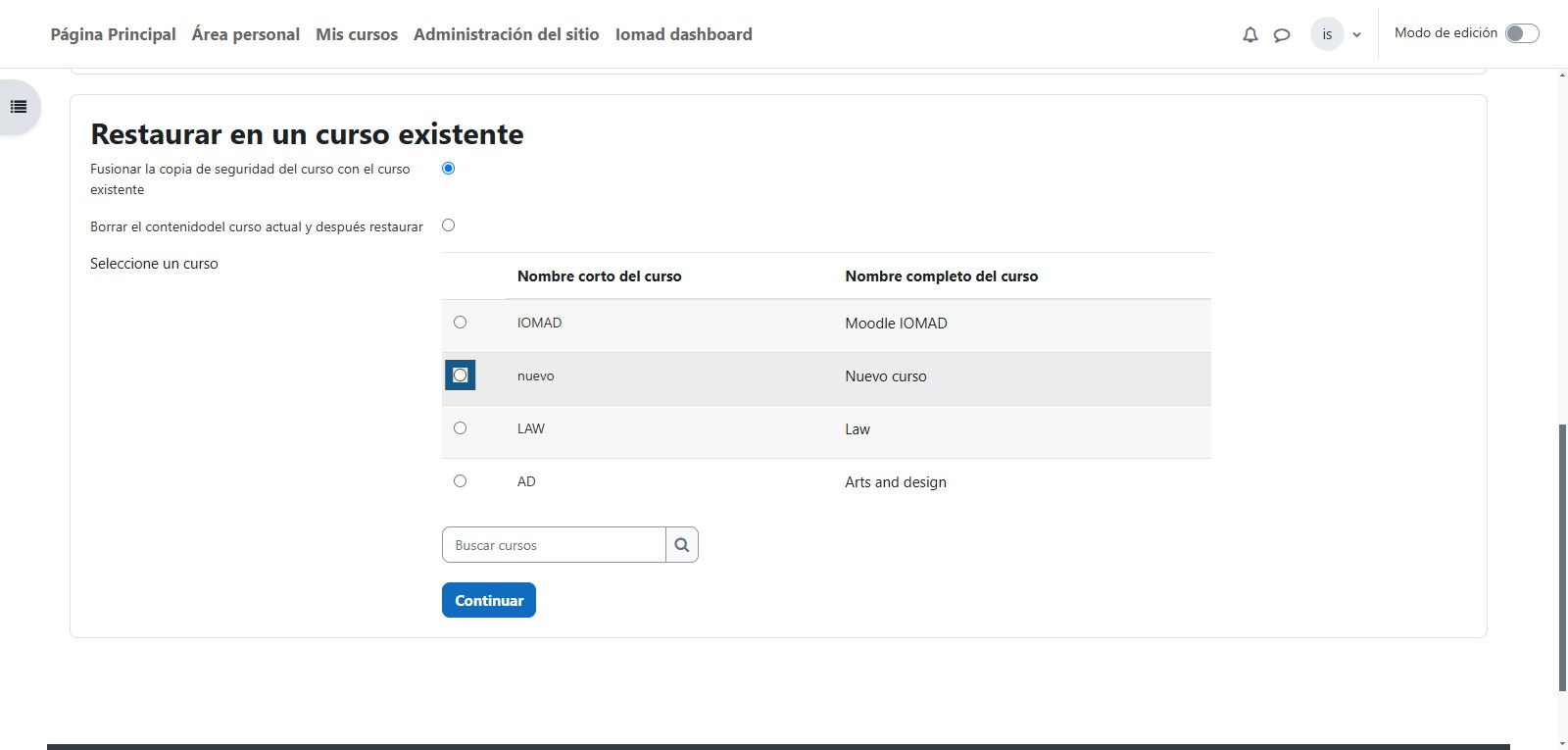 Una vez seleccionado el curso en el que se restaurará la copia de seguridad se debe dar clic en "Continuar"