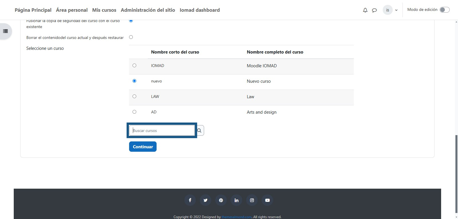 Por medio de la siguiente opción puede buscar el curso en el cual se restaurará la copia de seguridad.
