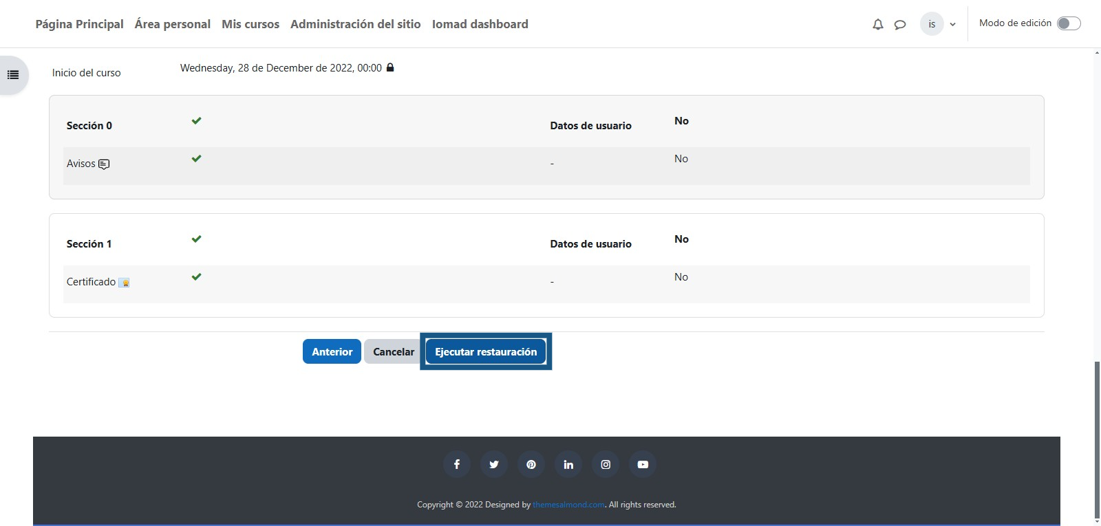 A continuación, se visualizarán los detalles que se restaurarán en el curso nuevo.